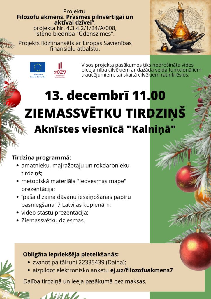 Biedrība “Ūdenszīmes” aicina amatniekus, rokdarbniekus un mājražotājus, kas lietas darina pašu rokām, pieteikties Ziemassvētku tirdziņam. Tas norisināsies Aknīstē, viesnīcā “Kalniņā” 2025. gada 13. decembrī no pulksten 11.00.